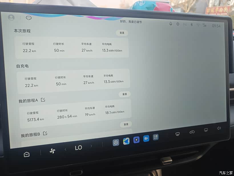 就像配图中展示的,今天这段22.2公里的市区通勤路,耗时50分钟,平均车速27km/h,属于典型的早高峰路况。最让我满意的,是13.3kWh/100km的平均电耗。这个数字非常扎实,意味深长着在这种走走停停的路况下,车辆的能量管理做得相当出色,空调、车机等电器全开,也没有明显虚标。对比“我的旅程A”里长期综合18.1kWh/100km的电耗(包含了高速、冬季和激烈驾驶),今天的表现堪称“黄金右脚”模式,但也证明只要路况和驾驶习惯稍好,T1的能耗完全可以控制在一个很经济的区间。