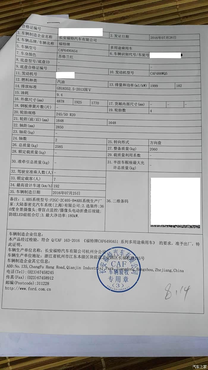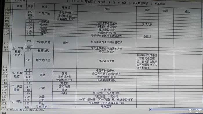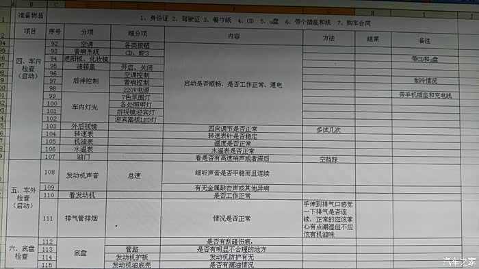 事前做了详细功课,自己做了一个验车表,检查时感觉还是很管用的。特别是丈人,职业司机,对车子很了解,所以底盘和发动机舱交给了他负责。自己负责其他事项。大约1个小时,认真检查完毕,交钱,车价332800.拿合格证。赠送全车脚垫和前后杠,订车时抽中一个儿童皮划艇,还没有拿。