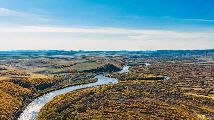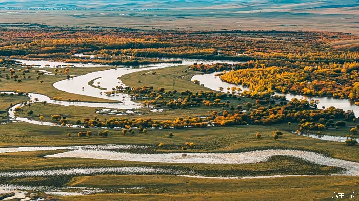 对比列夫湿地,额尔古纳国家湿地公园显得有些平庸,从黑山头开往额尔古纳市,我们又一次开往大兴安岭的西麓,额尔古纳是草原向森林的过渡阶段,起伏的丘陵逐渐增多,公园步道正是依山而建,登高望远,脚下大片大片的湿地铺展至天际线,河道百转千回,与草原的相接之处总带着优美的弧线,于是那金黄的草原与孔雀蓝的河水便总是相依相偎迤逦缱绻的模样,你中有我,我中有你,串起了眼前的整个大地,那是种辽阔壮丽大气的美,和列夫湿地的优雅之美截然不同。