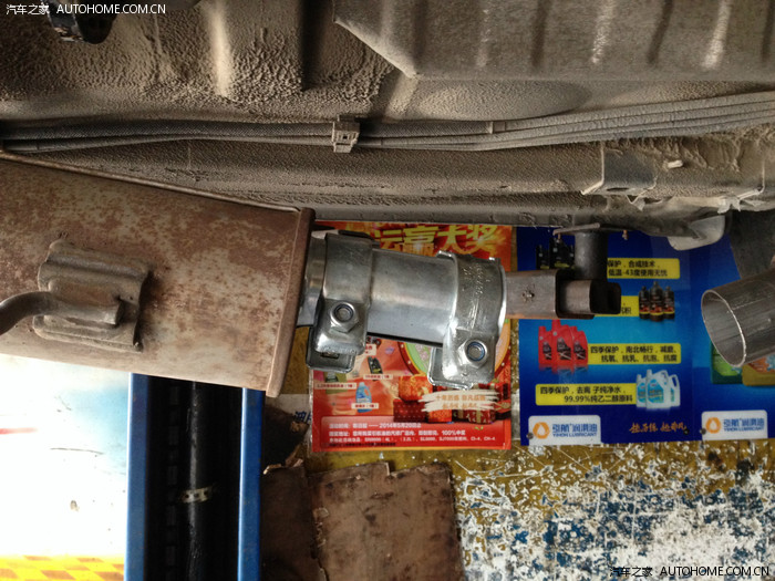 换了个新管箍,连接后面的消音器。这个管箍有点儿密封不严,按上去后一着车就漏气了,后来用密封胶密封了一下好了。