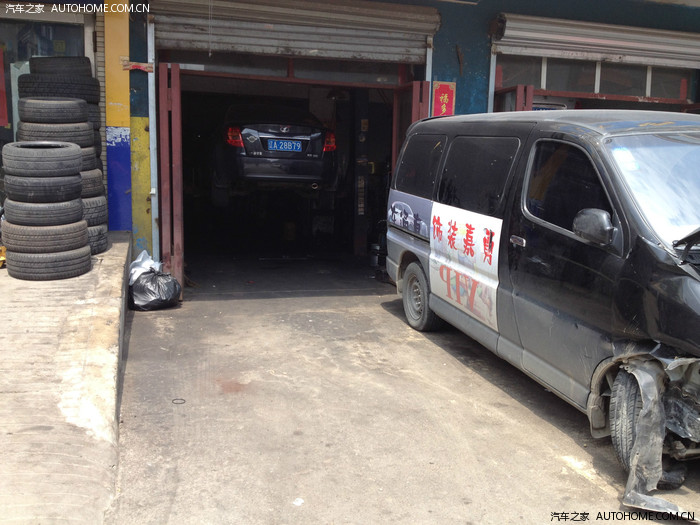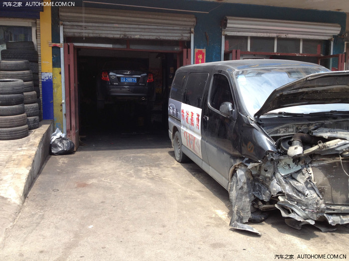 朋友的修理厂一共两个库眼儿,另外一个有车在上面下不来,这个还被事故车挡住了一部分,就给我留了刚刚能过去的位置。我还是把一侧的倒车镜收回去才勉强进去的。