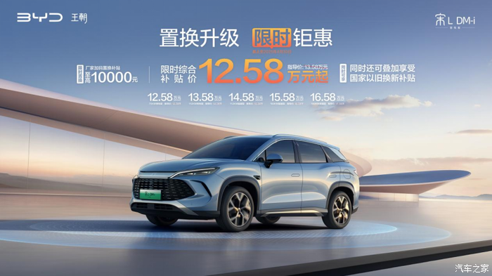 家里那辆老车开了快十年,油耗高、小毛病多,早就想换了。最近看到比亚迪宋L DM-i的置换补贴政策,算了一下账,感觉是时候出手了。具体优惠是到4月30日,厂家置换补贴加到1万,加上我这还有地方补贴,最低11.68万就能提车,这价格确实让我心动了。