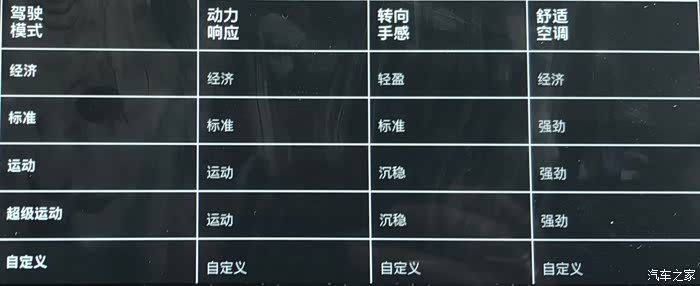 自定义模式(CUSTOM):选择自定义模式后,在车辆停止时驾驶员可通过娱乐显示屏自由搭配动力、转向、空调的模式。