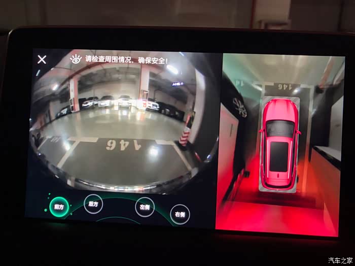 2、点击中控台上的360按键,进入360全景影像显示画面,可以触摸显示屏上的前后左右,来查看车辆周围不同视角的图像;