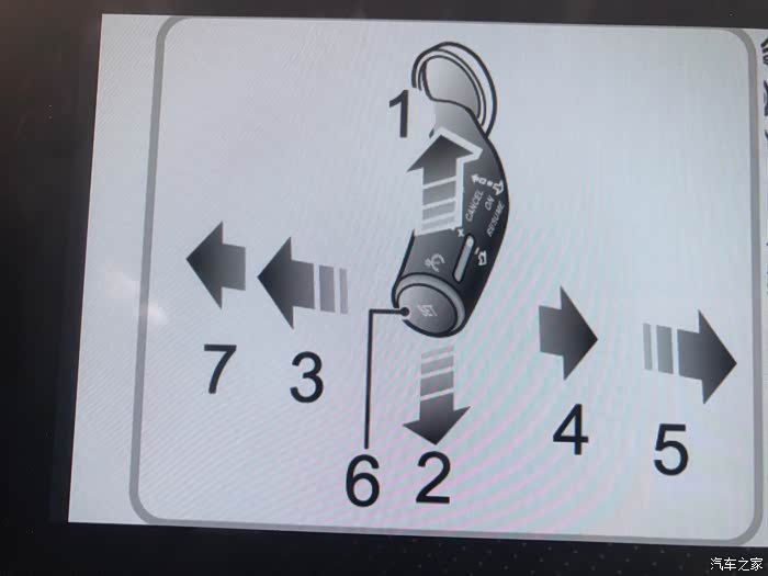当巡航拨杆位于(图书7)位置时处于关闭状态,将巡航拨杆拨至(图示4)位置时,仪表上的黄色巡航指示灯点亮,巡航系统处于待命状态。