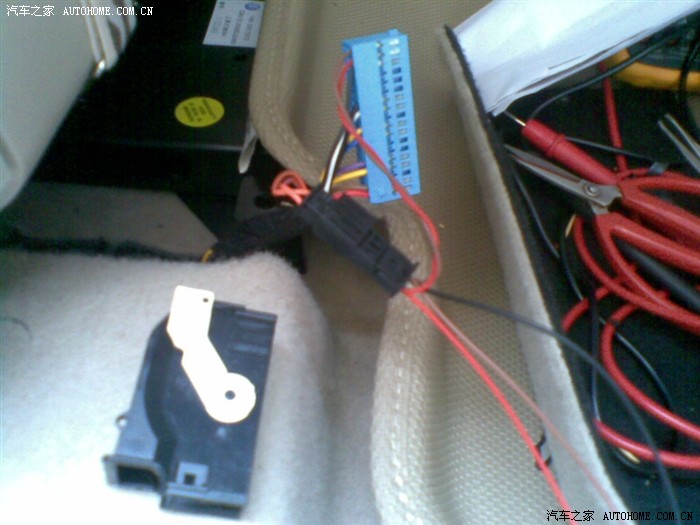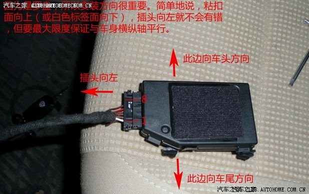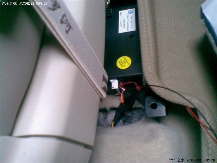 3、加装方案:蓝牙模块是放置在副驾驶座位下面,把副驾驶座后移到底、看到有一块毛毡用两个塑料卡子卡着的,里面就是蓝牙模块,实现手机蓝牙电话功能的东西,蓝牙模块有电源、地线及通讯的CAN线,具备电子罗盘并接的条件,且蓝牙模块在副驾驶座位下面,直接并接不用动仪表台里的东西。减少损伤及异响之类的。