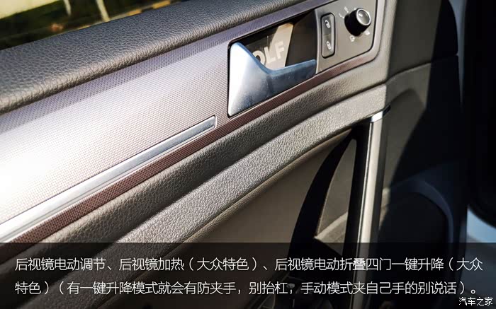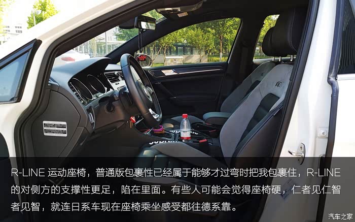 2、GOLF R-Lin座椅,坐上去被夹在里面,在过弯时,就好像有个肌肉男用力托着你的肋部和腿部,大众车座椅还算符合亚洲人的体型,这一点给赞!但是座椅角度调节是手动旋钮,大幅度调节这的确有些费力,但小幅度调整却很精确,能避免安全上的隐患,就算行驶中也可以微调,手掰的那种就不行了,如果家里有孩子您可要看好,开车时别淘气的给您座椅扳倒了。