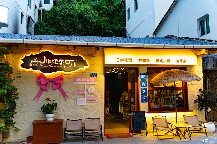 这里有很多这样的店铺,直观看上去就很有氛围感,墙体装饰、灯光、露营桌椅、坐在这里吹着温柔的海风、伴着动听的音乐,很不错的体验