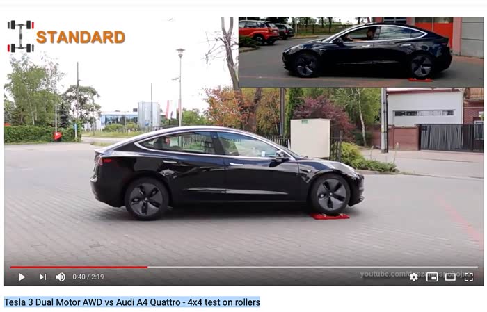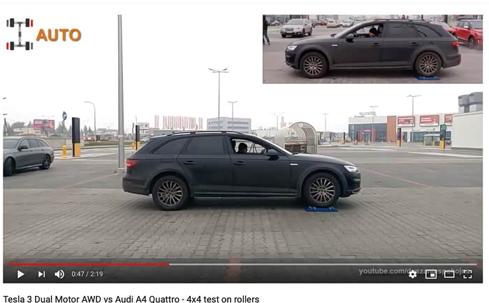 Tesla 3 Dual Motor AWD vs Audi A4 Quattro - 4x4 test on rollers