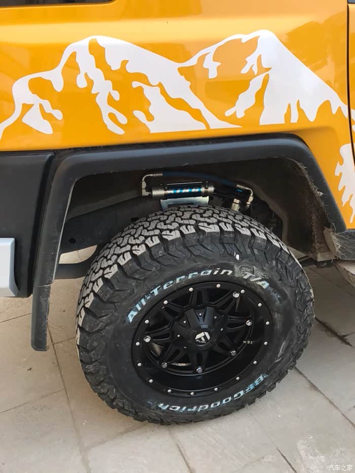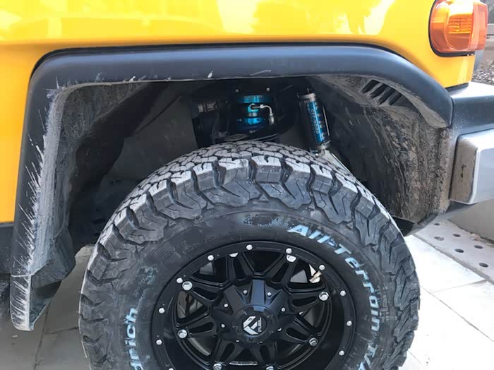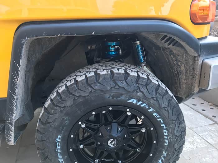 四个减震装就用了一整天,还不包括后续调节绞牙的时间。king的减震是升高2寸起,轮毂如果不加宽,重心会上移,会不安全,于是负值轮毂和加宽的外胎就是必须的了。轮毂采用fuel的负值轮毂,外胎百路驰ko2,275的宽度,把车重心稳了下来。