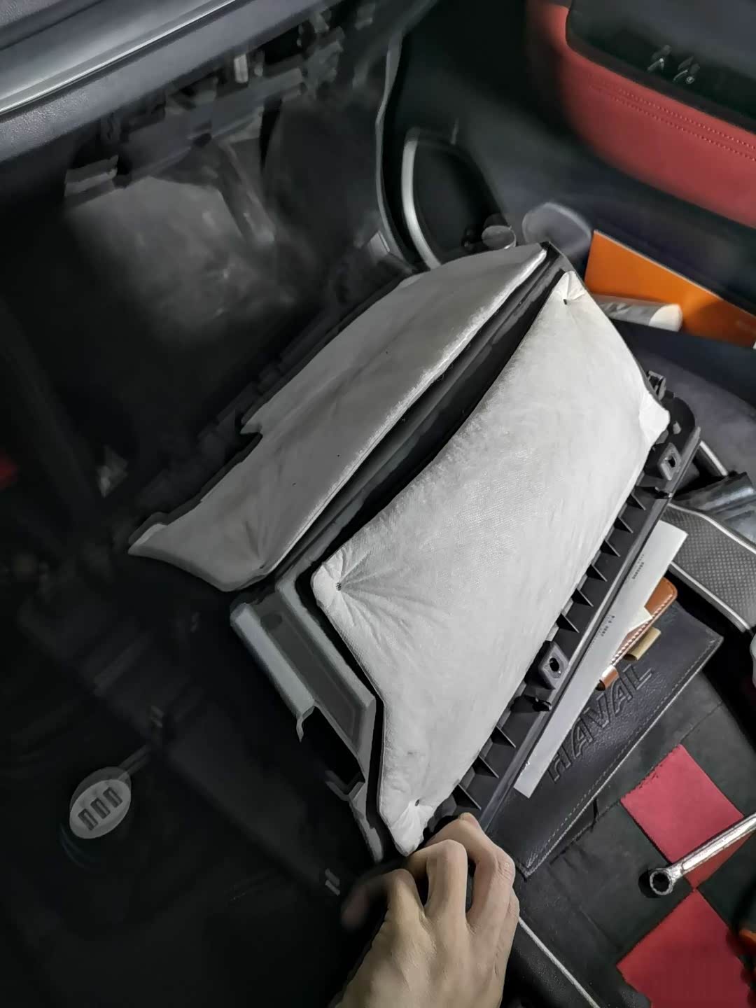 这就是我们的滤芯盒了,在左侧按住卡扣向外拉就打开了,把旧的拿出来按照原来顺序安装好新的滤芯。可以清理一下进气风箱里面的灰尘,总会有点灰尘在里面的,清理一下安心