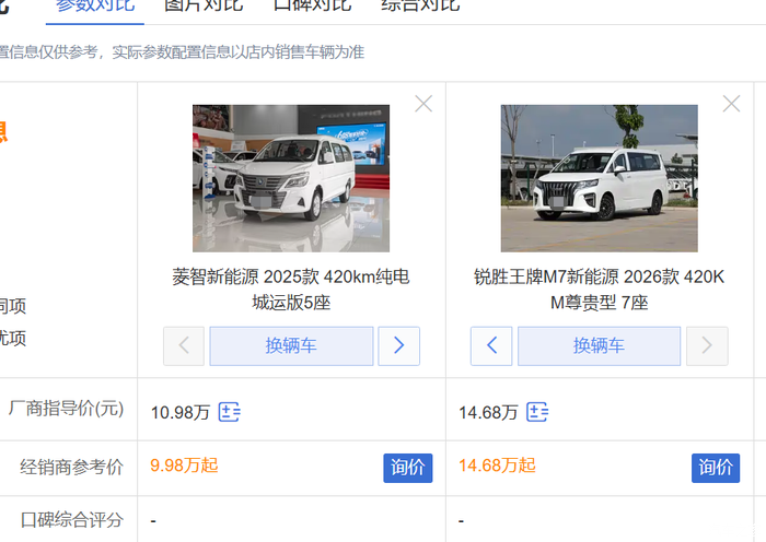 不过王牌M7新能源的420km续航车型,起步就是14.68万了,价格对我来说还是有点高。菱智新能源5座城运版只要10.98万,而且现在有1万元优惠,算下来就要比王牌便宜4.7万了。