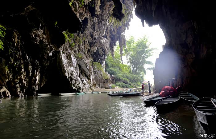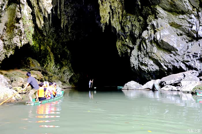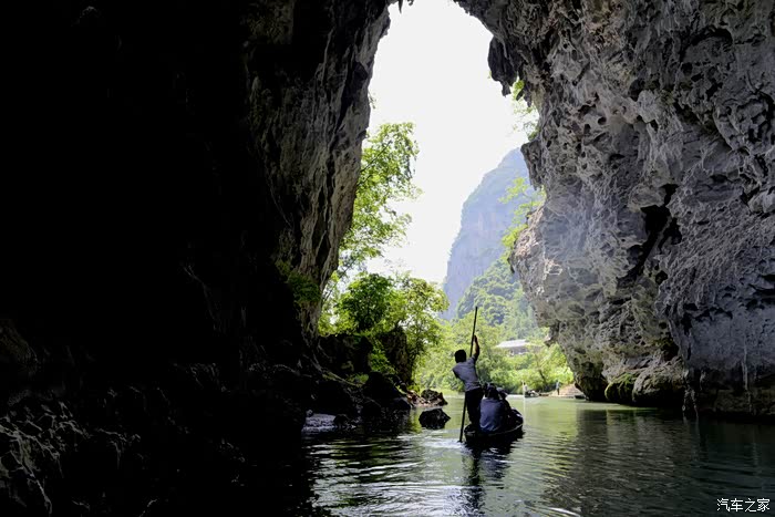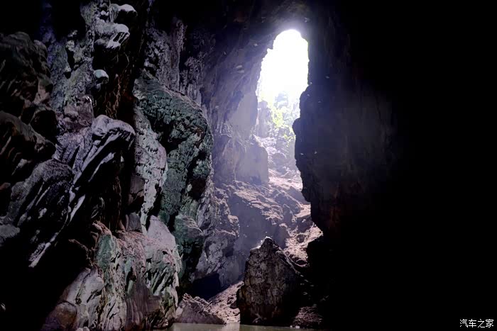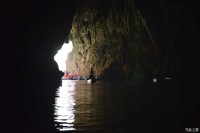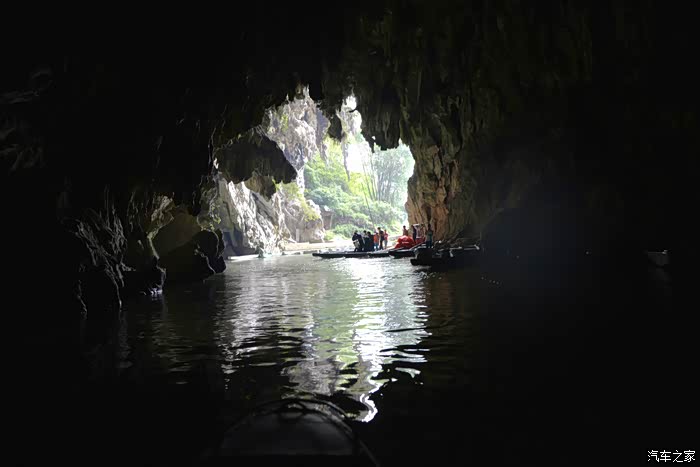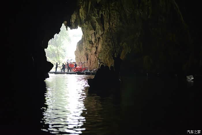 洞内没有任何灯光照明,越往里走光线越暗,直至一片漆黑到完全看不清洞内的任何物体,船家只能开着头灯划行......