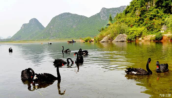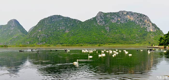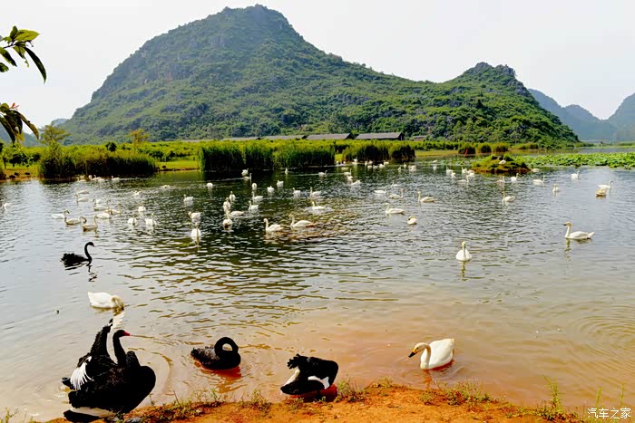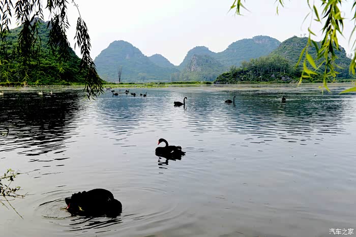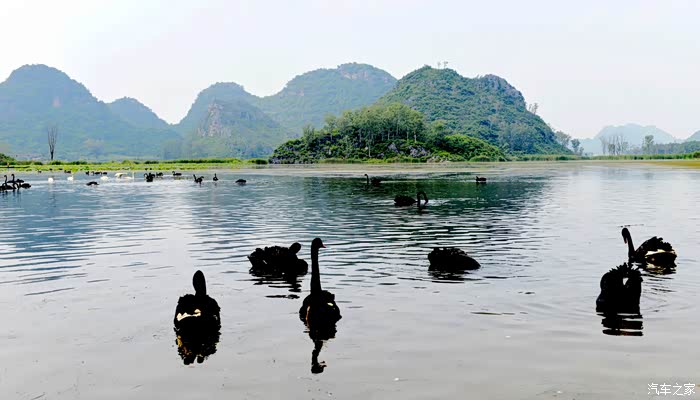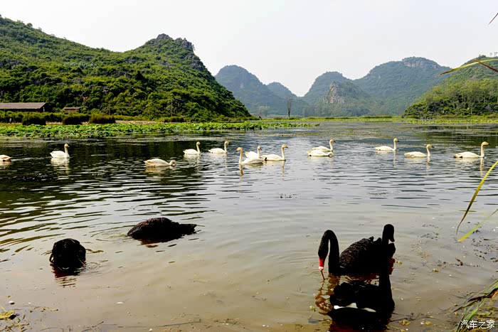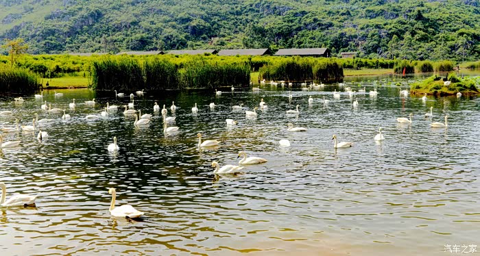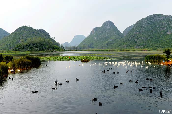 天鹅湖占地3平方公里,其中湿地面积2.6平方公里,是一个集喀斯特孤峰群、湖泊群、溶洞群和品种繁多、品质优良的野生动植物种群于一体的湿地生态群景区。其中天鹅是这里的当家花旦,乖巧温顺,亲近人类,很讨游客欢心。不过听说这些天鹅的翅膀都是被扎着的。