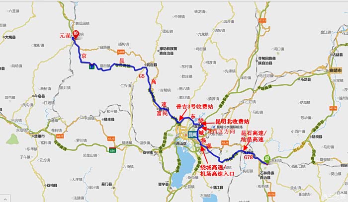 行程十二:石林- 昆明(沿东绕城高速)-昆明北收费站-普吉3号收费站-富民-武定-元谋。
