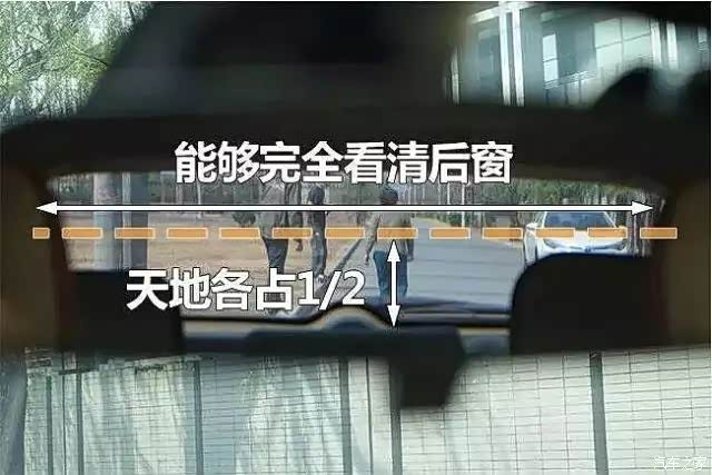 内中央后视镜,它的调节就相对简单许多,很多人调节中央后视镜的误区是拿它来观察后方乘客或者觉得它碍眼,直接扭到朝天上的角度,正确的调节是通过后视镜能够透过后车窗看到车后情况,地面和天空的占据比例在一半,这时就可以了。