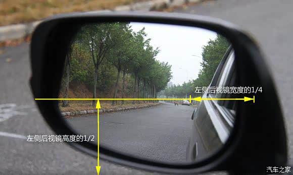 首先是左侧后视镜,驾驶员要以地平线为基准,通过调整上下角度,让后视镜呈现的天、地各占一半。