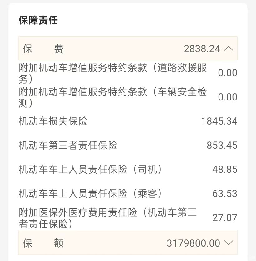 1、保险费:第一年新购车辆,必须上全险,当时4S店给的价格我还是挺满意的。交强险950元/年,车船税150元,商业险(包括车损险、第三者责任险等)为2838.24元,强制捆绑了一个组合保险是338元,这个感觉不是很实用,保的是法定节假日和玻璃破碎造成的玻璃膜损失这种可有可无的东西,但是因为新车,自己没得选,明年续保这一项就可以去掉了,总共加起来是4276.24元。