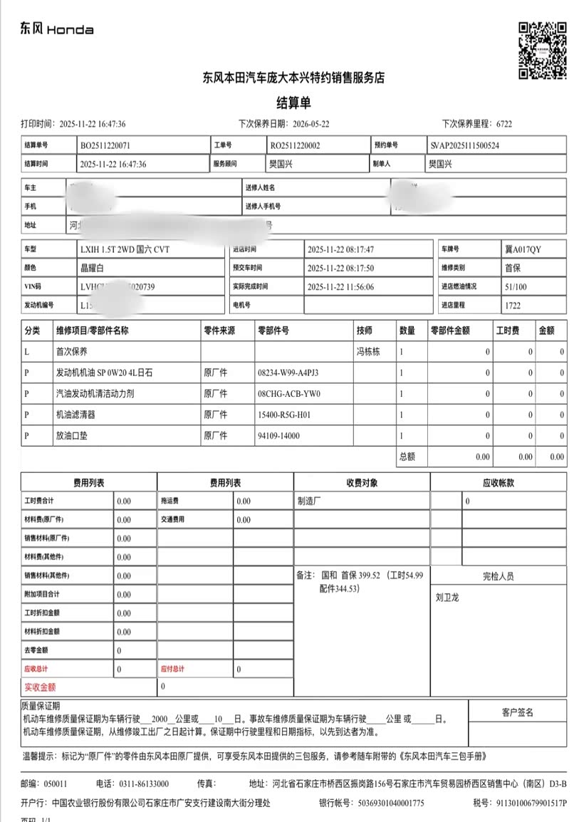 5、保养费:本田官方建议每5,000公里或6个月保养一次。我的车刚过去首保,首保是厂家赠送所以没有花费,大概咨询了一下店里,我这辆车购买时赠送了终身机油机滤,所以如果只换机油机滤的话,每次只需要花费220元工时费,手册建议每次保养加汽油清洁剂是140元,保养辅料约100元,所以推算下来全年保养花费大概是(220+140+100)*2=920元。这个感觉性价比不是很高,这还是赠送机油机滤,我实在不知道辅料费100元指的是什么,有没有车友可以解答一下。