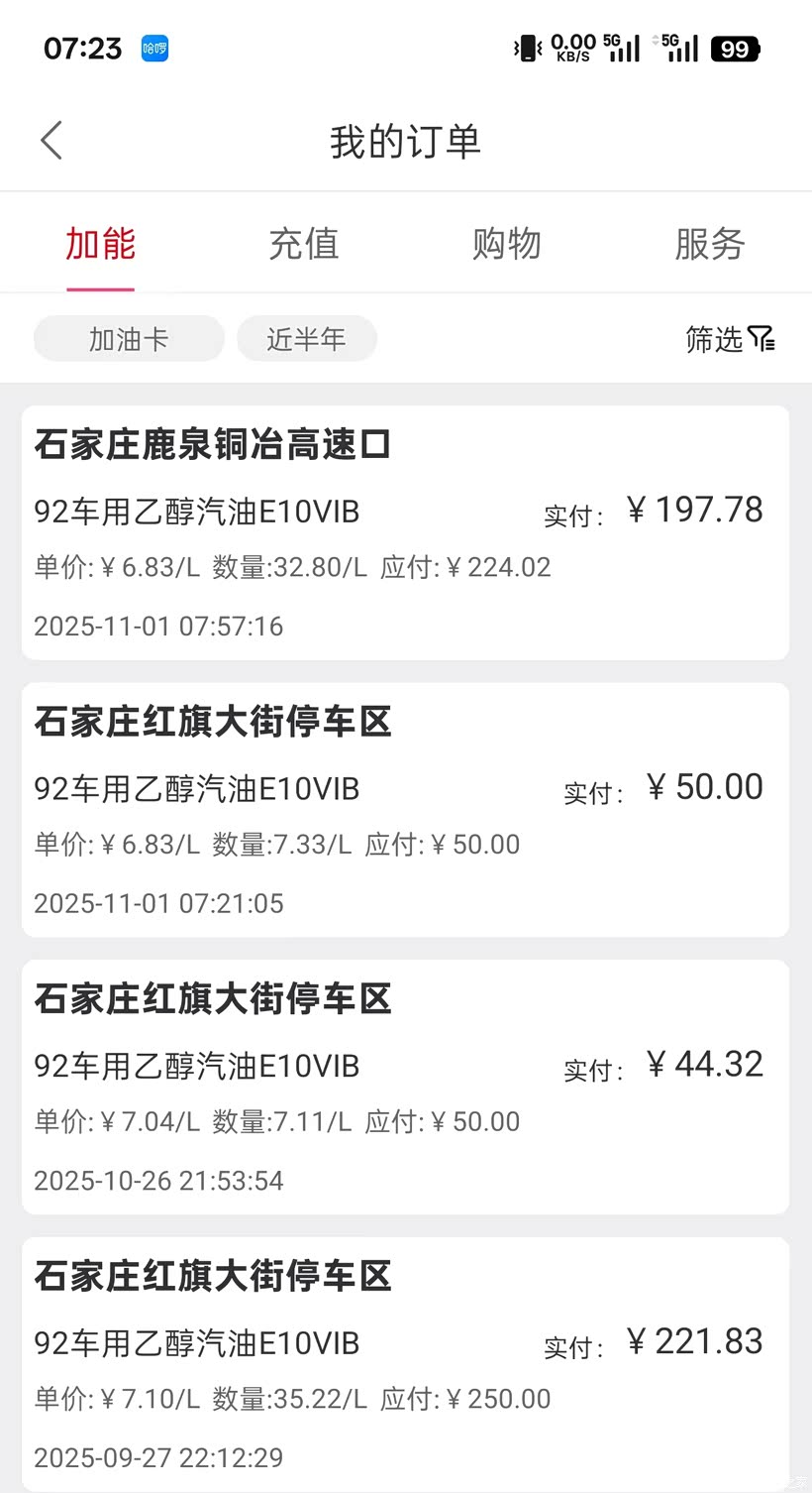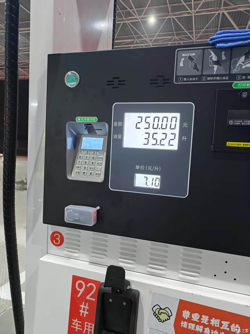 2、油费:我这辆车官方油耗约6.7L/100km。但我实际驾驶下来市区早晚高峰基本都是10-12L/100km,路况好走快速路是油耗大概是6-8L/100km,所以算下来平均油耗是在8.5L/100km,从我七月加油到现在92号汽油均价约7.1元/L,我一共加油花费1056元(中石化优惠后的价格),行驶1848公里,算下来平均每公里0.6元,还是可以接受的,推算下来全年加油花费大概是1056*4=4224元。