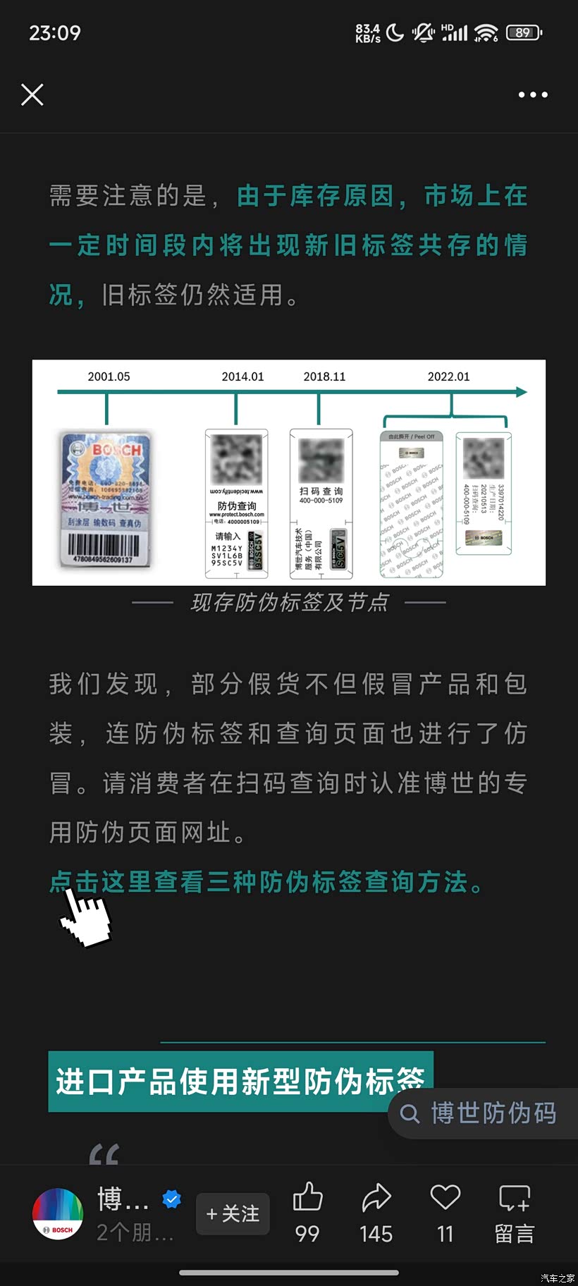 以后车友们买配件的时候留个心眼,该验证的验证。博世的最新防伪码已经很方便查询了,随手的事,不要侥幸。我遇到的这个是第一代防伪标签,很难查证了。电话短信网站都失效了,千辛万苦才找到了一个验证网站。在博世的官方公众号里也有教大家如何看标签的真伪方法。感兴趣的同学可以前去学习一下。
