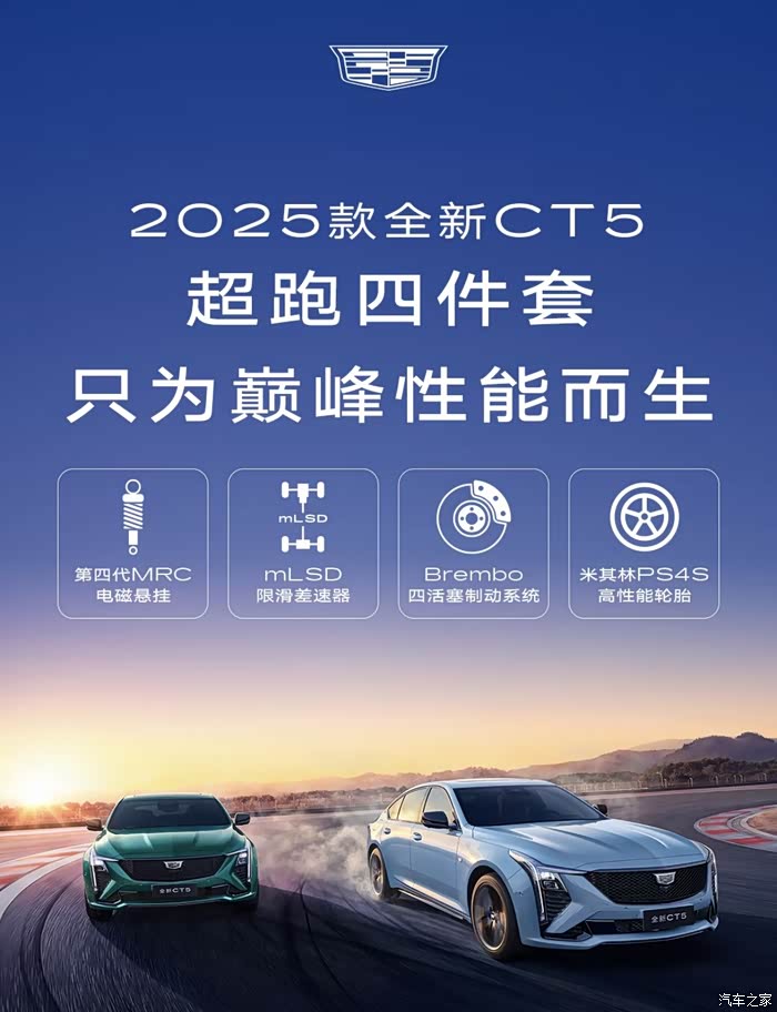 讲完动力参数方面那么不得不讲一讲CT5的超跑四件套了,这也是消费者为其买单的原因之一,首先是CT5的第四代MRC电磁悬挂,MRC电磁悬挂在行驶过程中可以每秒对地面进行1000次的侦测,根据路况实时无级调节悬架软硬,丝滑精准的调节大幅降低车身侧倾和俯仰度,从而提升车辆的稳定性,在这基础上CT5还配备着LSD机械式限滑差速器,这样在激烈驾驶的时候当后轴的一侧轮胎失去抓地力时,限滑差速器可以防止车轮空转,将驱动力传递到有抓地力的一侧车轮上。大力加速或极限过弯时,必须需要限滑差速器来保障动力的持续和平稳输出。因此 ‘’机械式限滑差速器‘’ 往往被喜欢运动性能的消费者当作是‘’ 真后驱 ‘’车型的判断标准之一。另外,不能光开的爽!还得刹的住才行!那么接下来,我们讲一讲CT5的刹车系统了,CT5采用的是 ‘’ 布雷博 ‘’ 四活塞制动系统,相信大家对于布雷博这个品牌略有耳闻,没错,就是在超跑上所配备的,可想而知CT5的刹车系统是有多么厉害,再搭配着米其林PS4S高性能运动轮胎的同时,赋予十足的安全感,关键时刻稳稳刹停,在前段时间的测试当中CT5以100KM/H-0制动距离仅用了33.08M,堪比法拉利F430和保时捷Cayman S等高性能跑车。