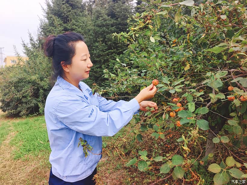 我把媳妇送到前厂办公楼会议室的途中,途经一片沙果树,媳妇下车给我摘沙果吃。