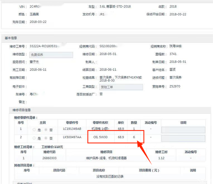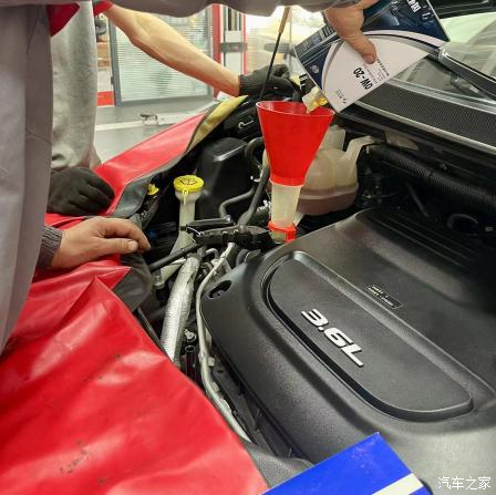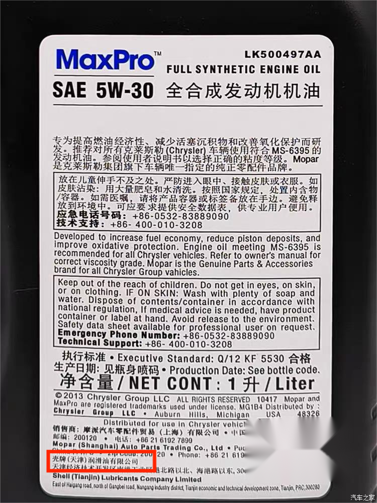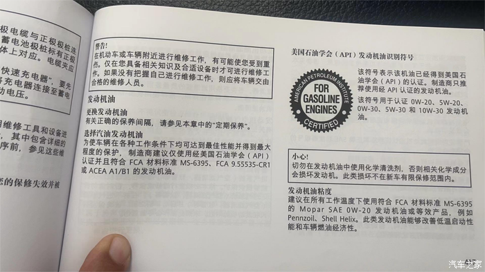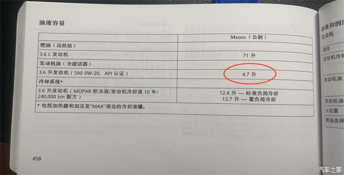 2023年10月21日进行全车大保养,公里数:78414km。原车主是广东珠海人,该车全程当地4s店保养,保养记录显示该车一直使用原厂5w30机油,每次加注6L机油,该机油为壳牌代工。查看车主手册要求:1.使用机油克莱斯勒MS-6395认证0w20或5w20机油;2.推荐使用Pennzoil、shell Helix。3.更换机油和机油滤清器需加注4.7L机油。4.机油更换间隔不得超过10000英里(16000公里)、12个月或350小时的发动机运行时间,以先到者为准。