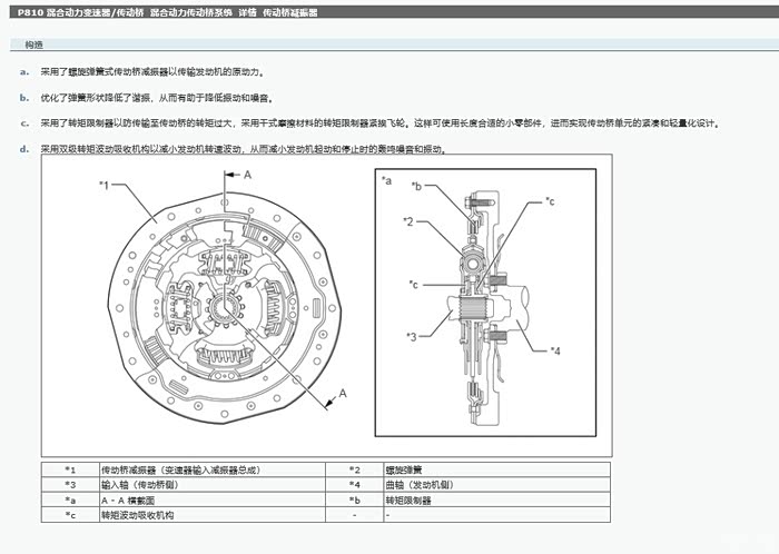 d.采用双级转矩波动吸收机构以减小发动机转速波动,从而减小发动机起动和停止时的轰鸣噪音和振动。