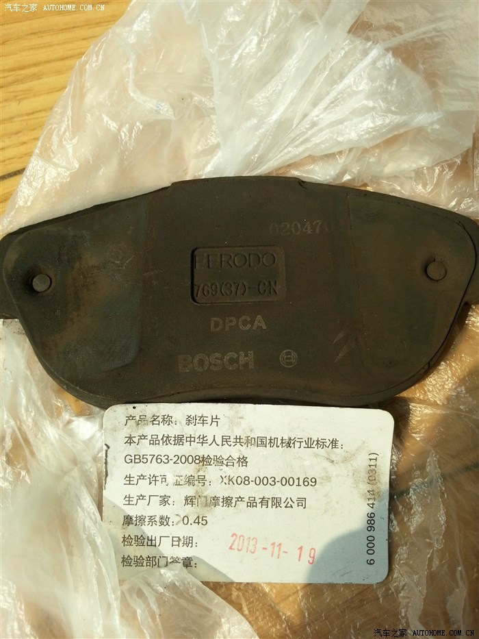 原来出厂的旧刹车片:标签是新产品的。正面是博世的供应商信息,背面是辉门公司生产商信息,辉门是世界上刹车片主要供应商。