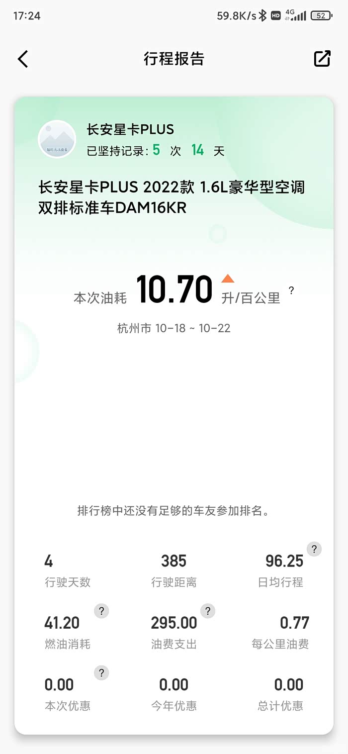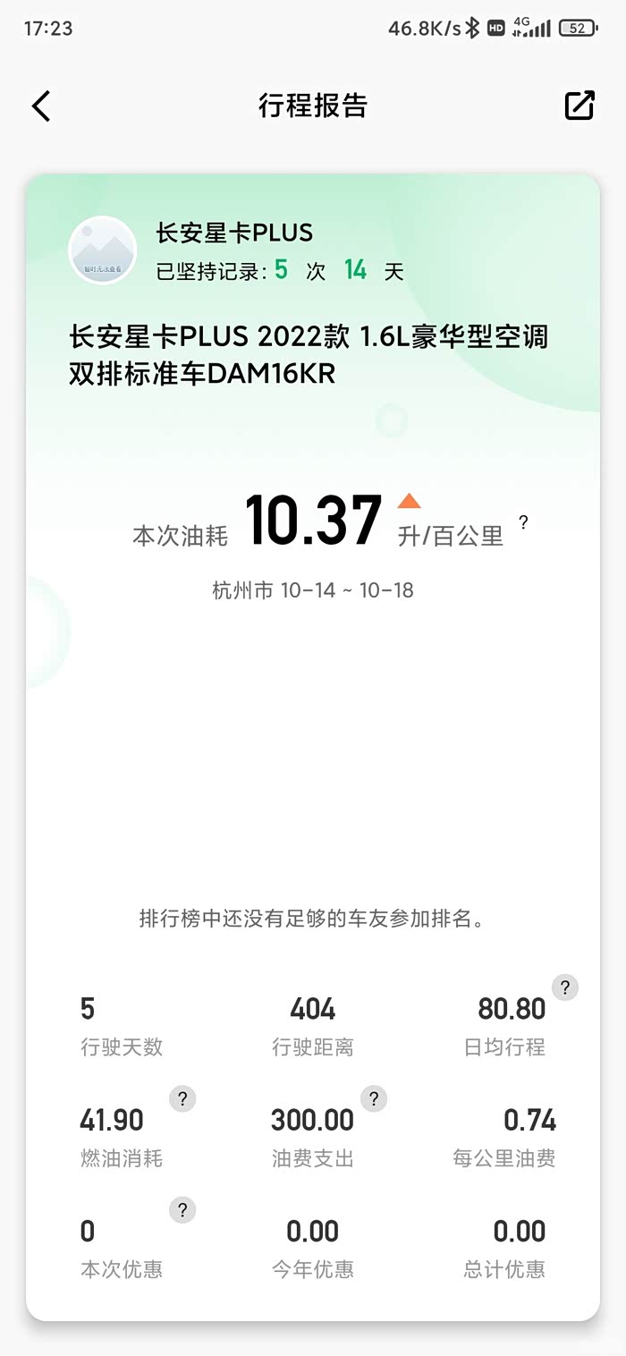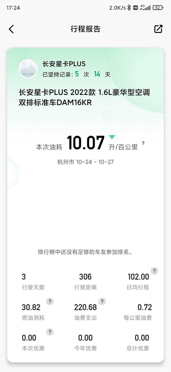 每箱油都是相差无几……加了优惠一元一升的油后差不多每公里都在0.75元左右。感觉油耗也不低,和我之前的老星卡s201双排比差不多,