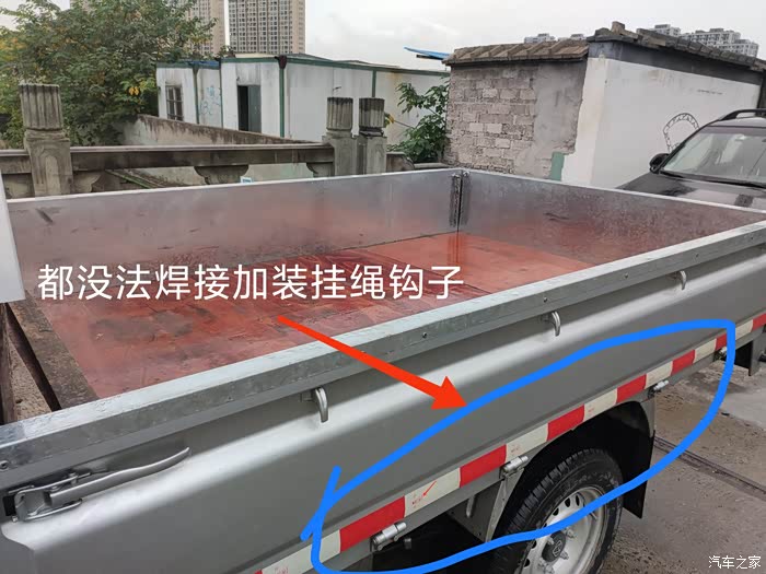 还有一个缺点就是门板上的绑绳子的挂钩太少不够用,门板下就两个,想要自己焊接几个都没法焊接。门板下面可以焊接的有位置没有大梁。能焊接的都是铁皮的地方。这个问题真是头大。没次拉货稍微装满一点绳子都不够挂的。也是个脑残设计