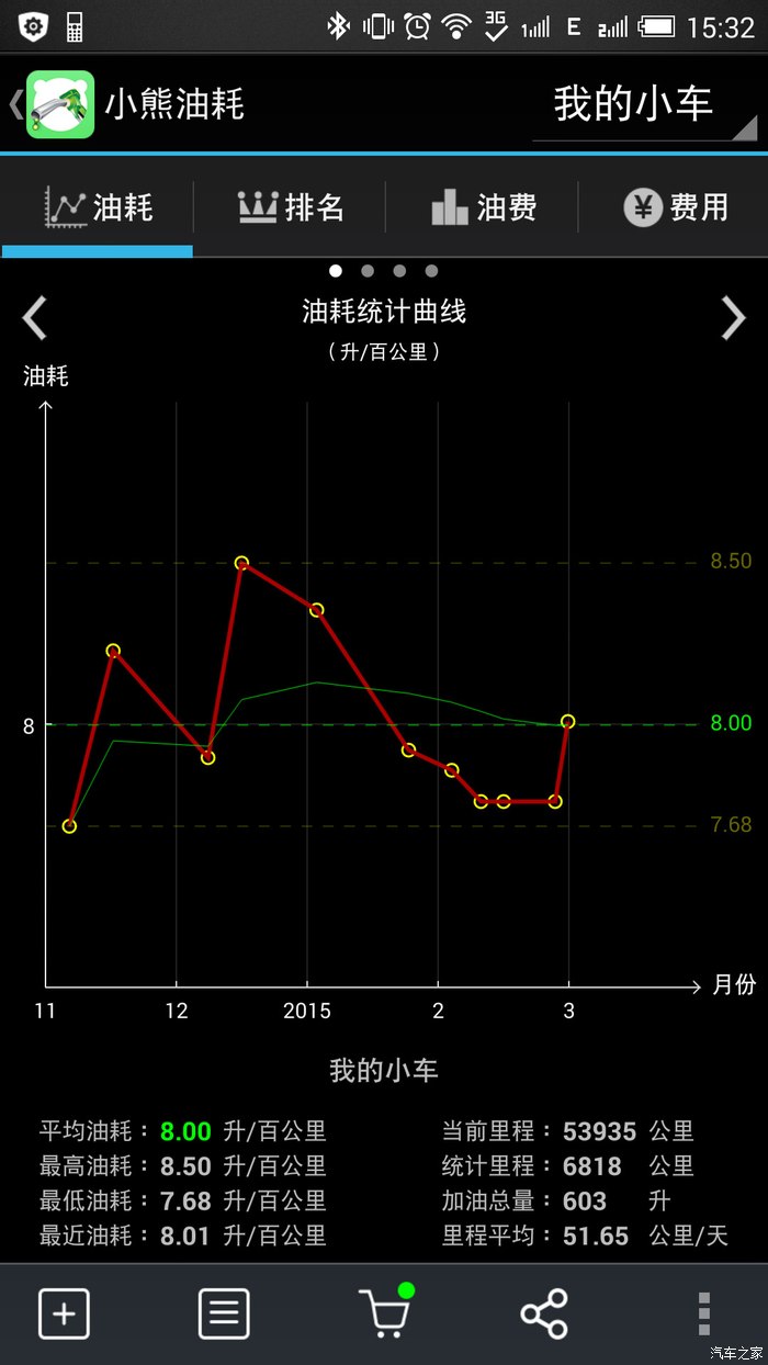 油耗:还满意吧。最近和同事拼车上班,一般满载5人,城市拥堵+城区+隧道+公路,平均时速40+,油耗8个正好。原来车上俩人的时候油耗不到7.5的说。有图为证: