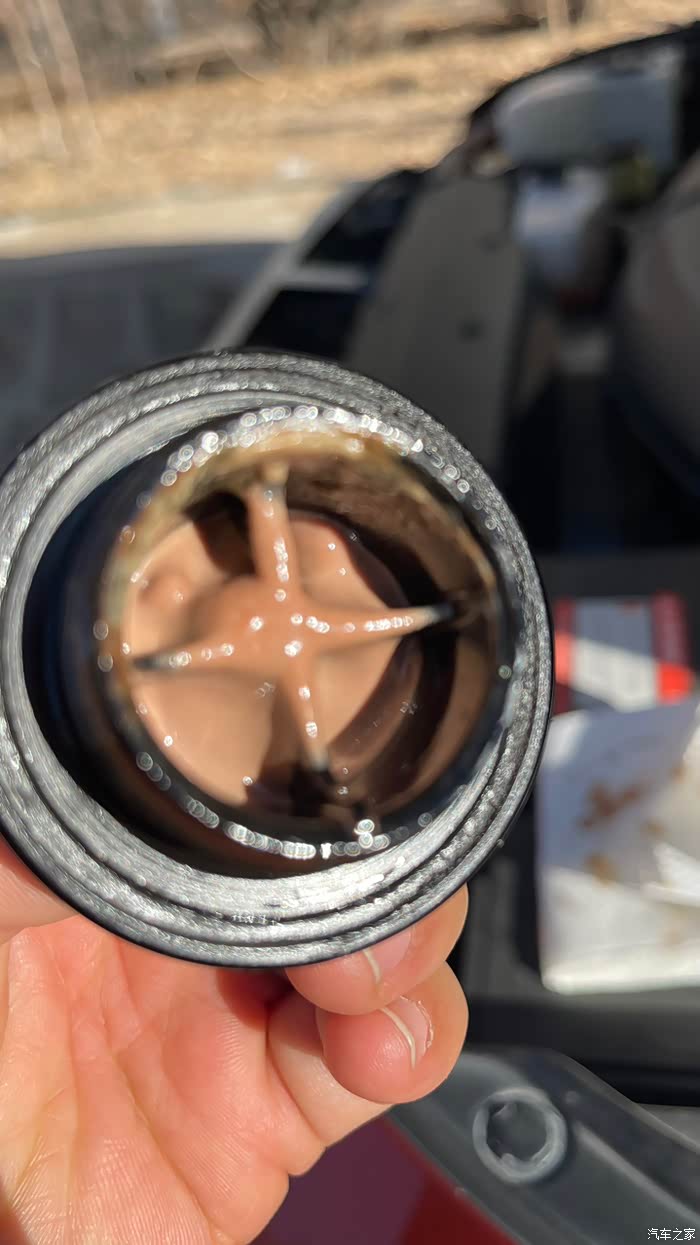这个颜色不太乐观 正常乳化应该是乳白色 年久长一点 也会出现焦糖色 属于正常,因为加油口儿部位是金属油管儿,每次冷热交替,水蒸气会向上蒸发,凝结在加油口处。此车乳化量比较大 这个颜色偏红 防冻液也是红色吗?