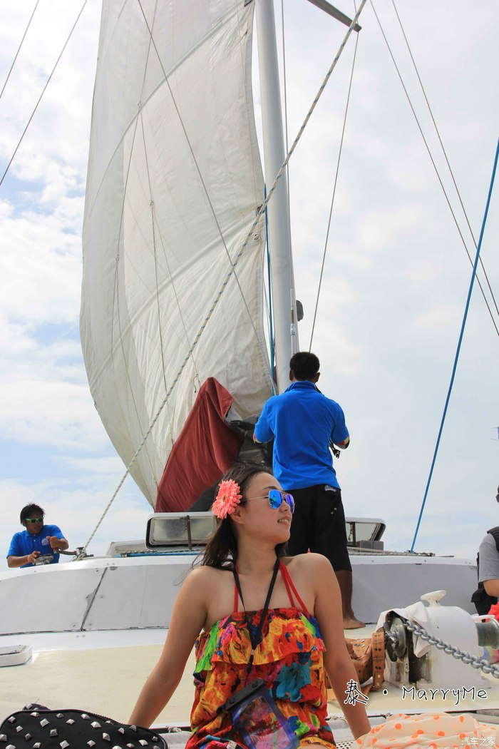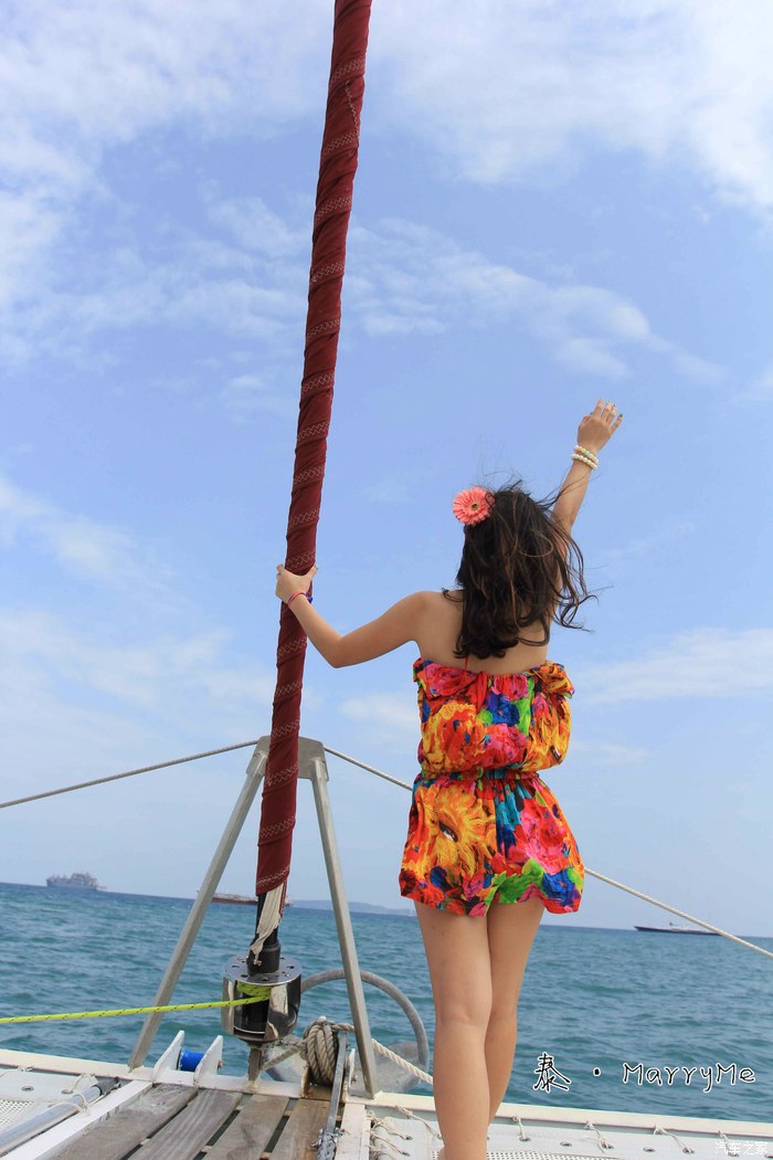 第一次坐帆船出海,真心觉得太爽了~船的前端弄了网,我们可以随便躺着坐着,船家还会提供水果饮料,加上天空海水都美得不像话,光凭这艘船,蜜月岛600人民币一天,就是值的,跟快艇比瞬间高大上有木有!