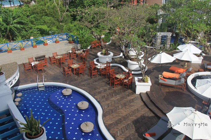 安达曼酒店,是这次旅行个人最喜欢的酒店,地中海风格装修,Tiffany蓝和白色相间的色调,还有酒店整个属于环形的,中间是泳池,相当漂亮,地理位置很很好,出门过马路就是卡伦海滩,门口就是餐馆一条街,步行5分钟就是类似小镇商业区的地方,唯一不足的是卫生间设施有点时间了,不算特别新~酒店同样布置了蜜月房
