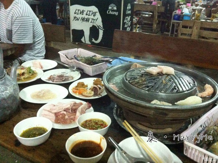 回酒店休息一下,就去了传说中的千人火锅,这个在清迈很有名,而且去的基本都是中国人,只要跟司机说到这,基本都知道。双条车开价100B,我们还到了80B,有点距离,回来的时候怎么都还不到80B。清迈的司机很注重先来后到,你先问了一辆车,如果价钱还不下来想去问停在旁边的另一辆,那么那个司机会说是第一辆车先的,这也算是遵守秩序的一种的,就算泰国人虽然开车快,但是很遵守交通规则不会乱超车变道一样。