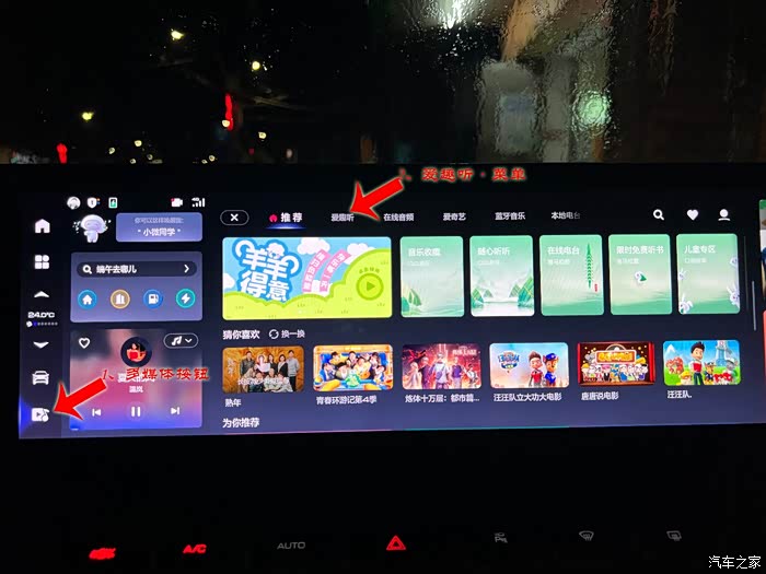 1、点中屏左侧最下面的“多媒体”按钮进入到多媒体界面,然后再点击上面的“爱趣听”菜单进入爱趣听界面。