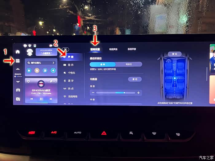 首先呢,设置车机默认的均衡器,也就是:中屏左侧的【菜单】→【系统设置】→【声音】→【音响设置】