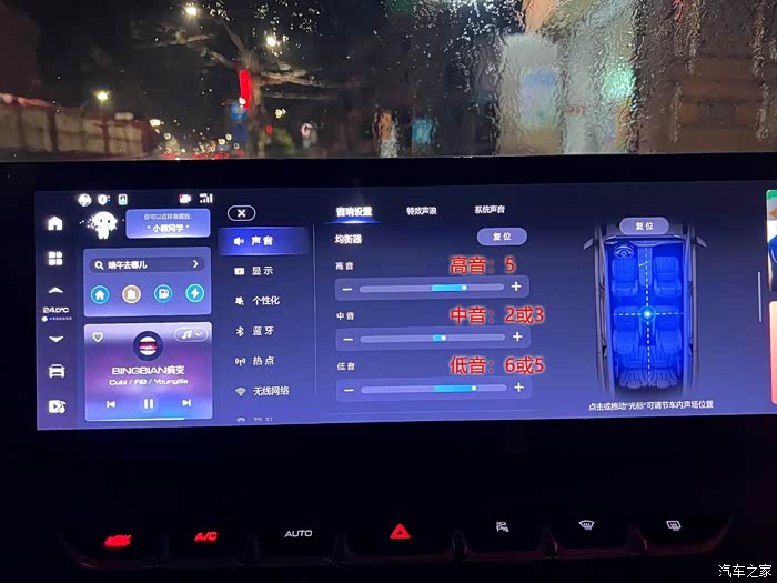 在这里面我们“最佳位置”设置的是全车,“均衡器”的高音、中音、低音分别是5、3、5,有车友是5、2、6,具体可以看你喜欢。
