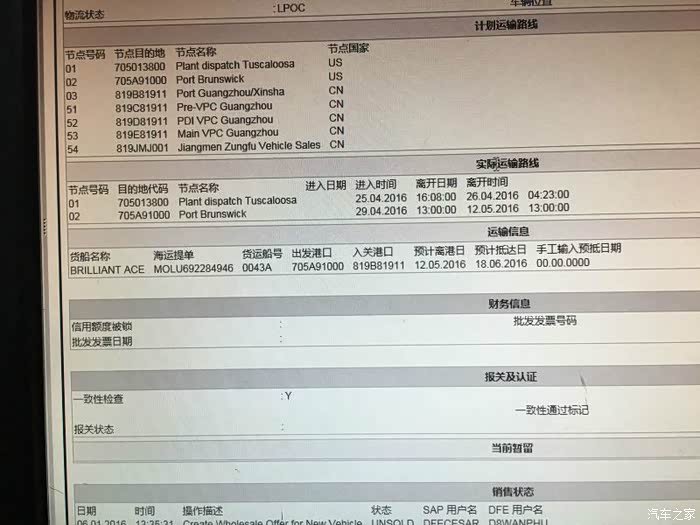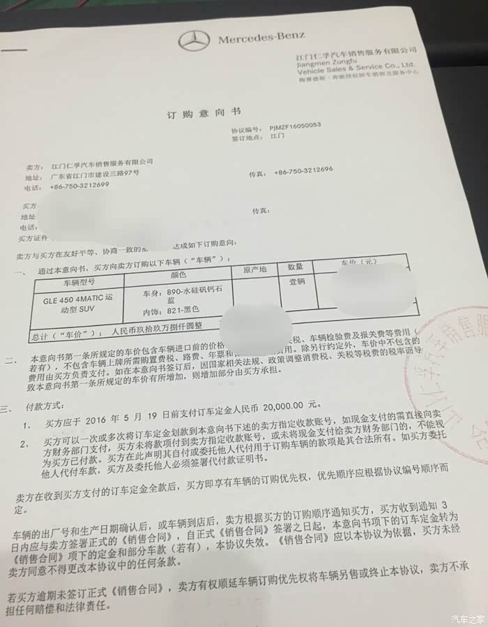 各种4s店都没我想要的水硅矾钙石蓝GLE450 Coupe,太难找了,最后现车找不到了更别说试驾了,回到了我们的小城市的4s店奔驰仁孚,让销售去找车订车,他说要是厂家订车要三个月到半年。我等不鸟了!他后来继续帮我找,竟然帮我找到了,正好是蓝色的,车子在船上来中国的路上,但是还没分配给任何店,当时我就立马就给订了下来。当天是5月19号,立马签下了订车的意向书。他还实时告诉我车子情况,车子是在美国那边工厂出的,跨过整个太平洋预计6月18号能到达中国广州的港口,还要加上报关啊报税什么的乱七八糟到提车起码还要多20天,真的好漫长啊,度日如年!
