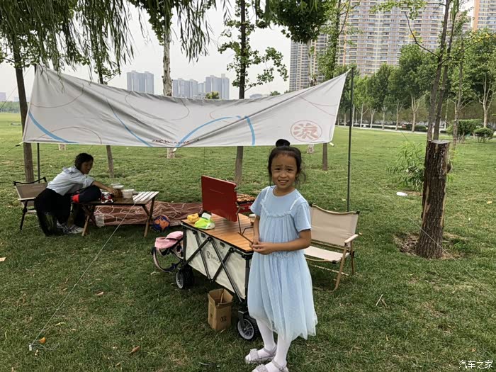 天幕虽然跟帐篷一样,无法应对狂风、大雨等多种天气,但是足以应对常见的小雨和大太阳天气。尤其是夏天露营,天幕既能遮阳,通风性强,还是很实用的。我买的不是黑胶天幕,勉强够用。在这里推荐车友们选择黑胶天幕,遮阳防晒的效果更好。