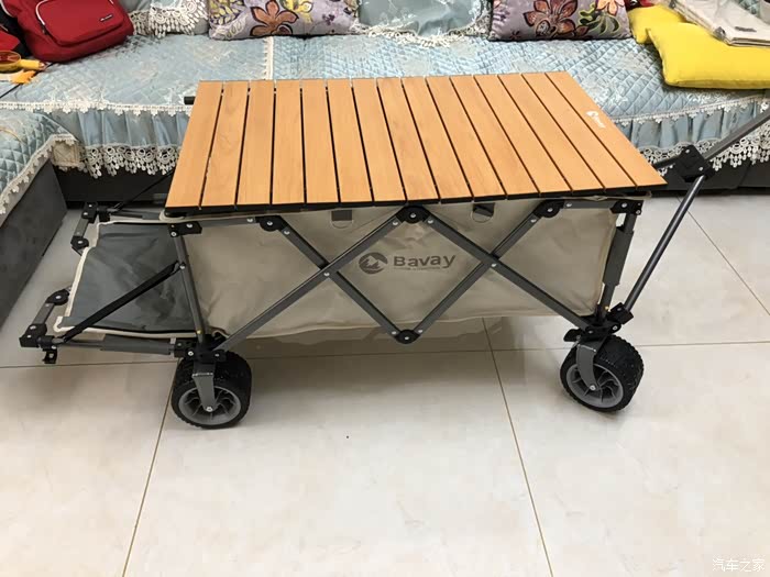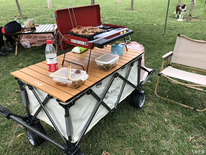 营地车推荐指数四颗星,属于比较推荐的露营装备。车子开不进去的露营地,营地车的作用就显现出来了。营地车的选择需要关注以下几点:1、材质结实且易收纳折叠。2、营地车的车轮尽可能选择宽一点的,遇到凹凸不平的露营地时更加平稳。3、可以考虑更多功能的营地车。我选购的这款营地车安装好以后,上边还可以用来做餐桌,底下放食材,尾门可以放平,里边的食材取用更方便。