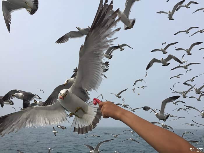 始海鸥还是吃方便面的,后来我们拿出自己带的火腿肠,海鸥们会拼命地来吃火腿肠的,他毕竟