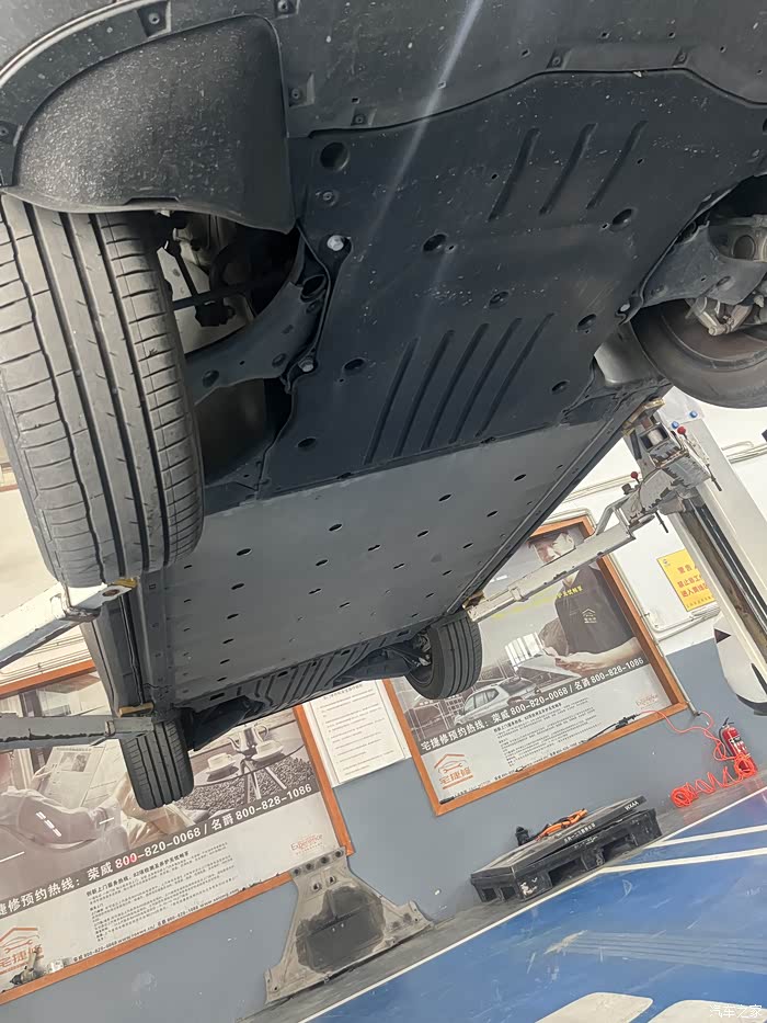 第一步:师傅将车辆停放至升降台,举升高度约1.5米,用强光手电检查底盘是否有剐蹭、漏液或锈蚀痕迹。