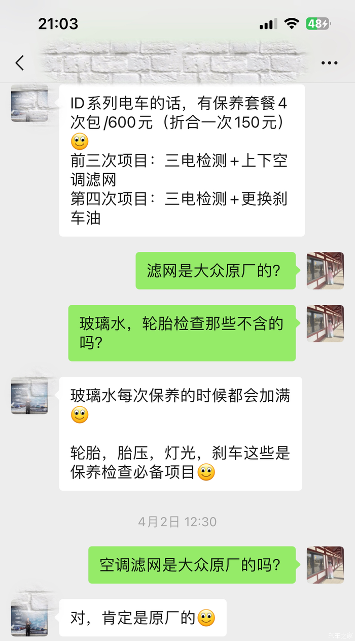 和师傅确认价格,以及包含的内容。最后确认自费保养600元4次,折合一次150元。