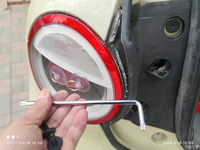 拆卸先用一字螺丝刀撬开塑料盖,再用T30梅花螺丝刀卸掉两个螺丝,然后用吸盘,用力水平拔出尾灯即可