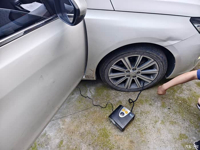 他轮胎应该是来的时候就没气了,轮胎侧面都挤压磨损了一些,如果是长时间这样跑的话,不仅轮胎要废,轮毂也要废。拿出充气泵接到点烟器上,启动车辆开始给他的轮胎充气,好在轮胎没有磨坏能够充上气,充了2.5mpa的气压,车子又能继续开了,但是他的漏气量有点大,要赶紧去补胎店补胎,我让他把充气泵带走,开一段距离检查一次,免得气漏完了。