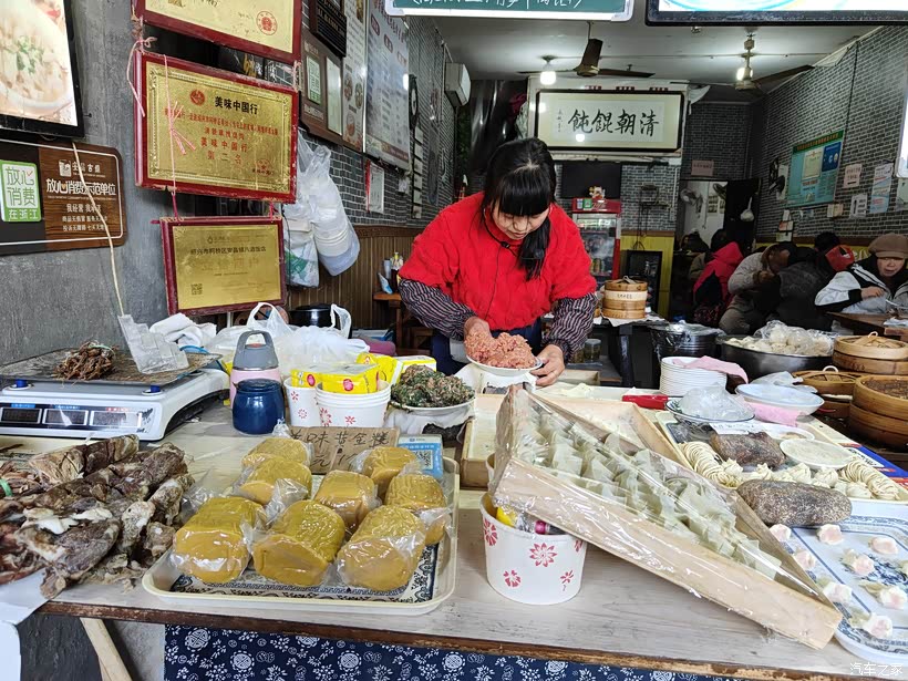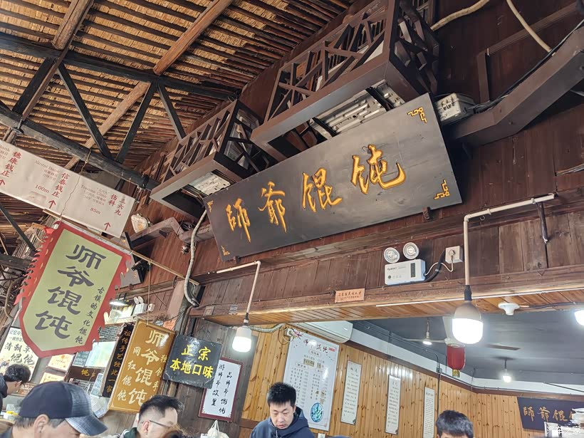 师爷馄饨:皮薄而馅大,精髓在于皮薄、汤鲜、手工现包。馄饨皮极薄,能透出肉馅;汤底是酱油、猪油加葱花,看似简单,却鲜得纯粹,吃的就是那股手工的烟火气。