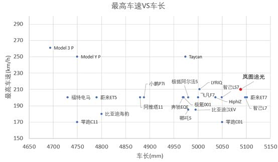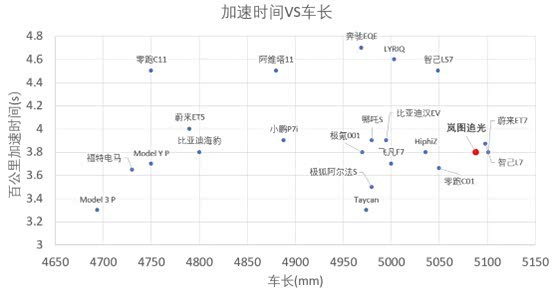 这里我们挑选出基本这个小市场上加速表现优秀轿车车型,这里反应的是车辆驱动电机的瞬时爆发能力,岚图追光这里作为一个基本长度算是最长的一批车,加速表现3.8s,属于偏中上游的一个水准。比之追光优秀的车型,要么车偏小,要么续航偏短。